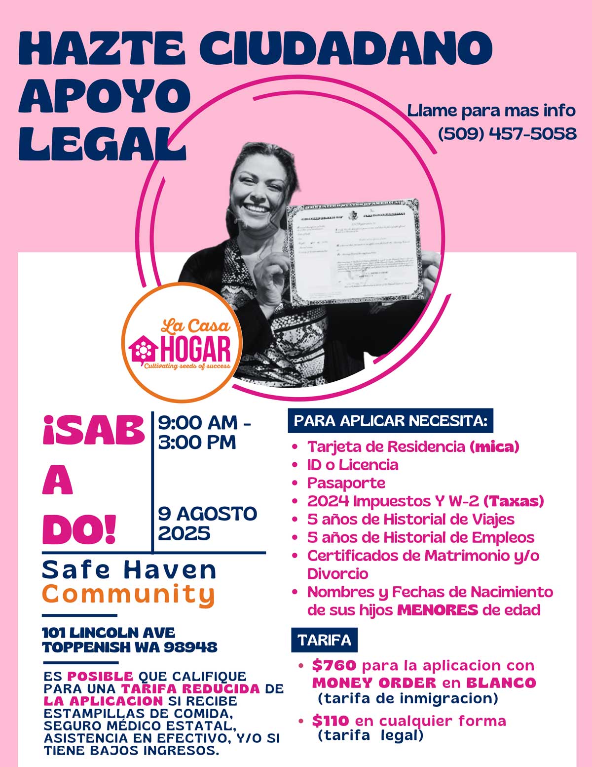 La Casa Hogar will host a clinic focused on helping Legal Permanent Residents apply for U.S. citizenship. Services include legal screening, application assistance, legal representation, and referrals.