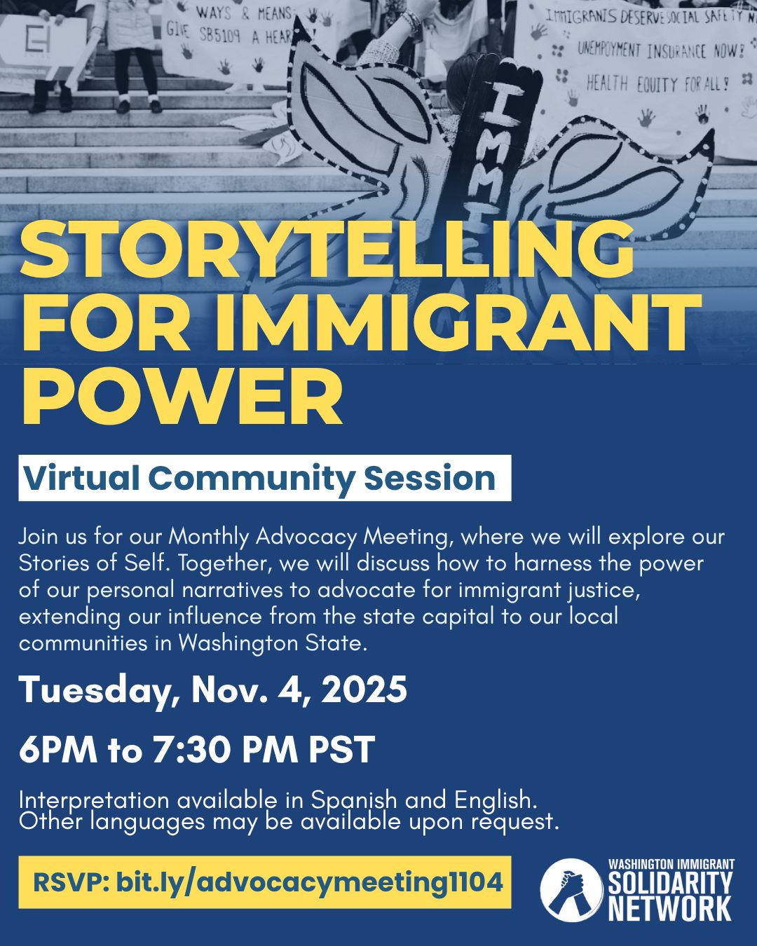 Immigrant and refugee stories carry a wealth of knowledge, traditions, and power. Join us on Tuesday, Nov. 4 at 6 p.m. for a virtual community conversation about how we can use our stories to strengthen our movement toward immigrant justice in Washington state. RSVP now at bit.ly/advocacymeeting1104